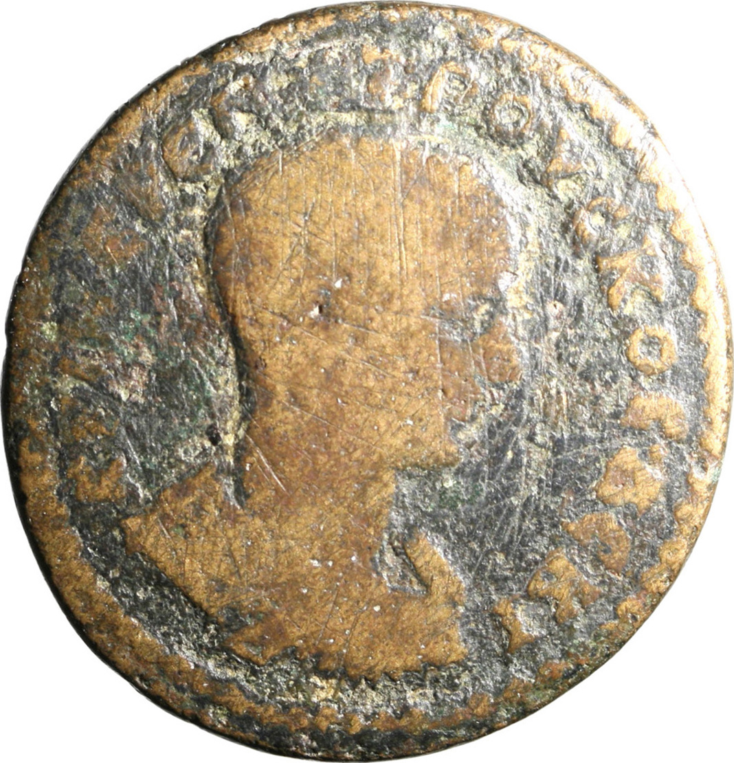 bare-headed, draped and cuirassed bust of Etruscus, right, seen from rear