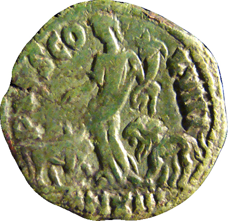 Moesia standing left, holding cornucopia; at left, bull standing right; at right, lion standing left |