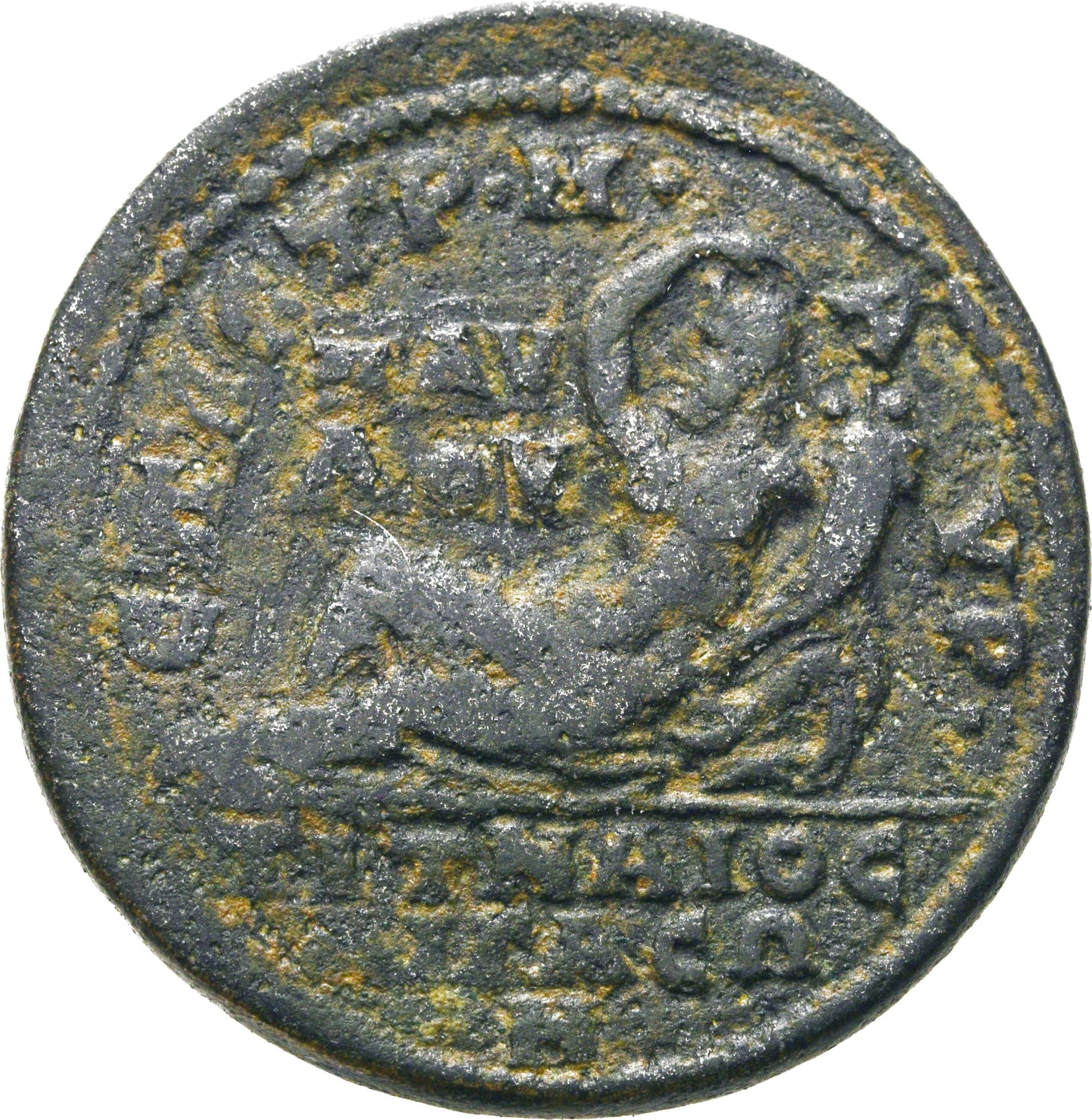 river god (Titnaios) reclining left, right arm over head, holding cornucopia and resting on overturned vase from which water flows |