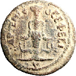 cult statue of Artemis of Ephesus standing facing, wearing kalathos, with supports between two stags; at left, star; at right, crescent