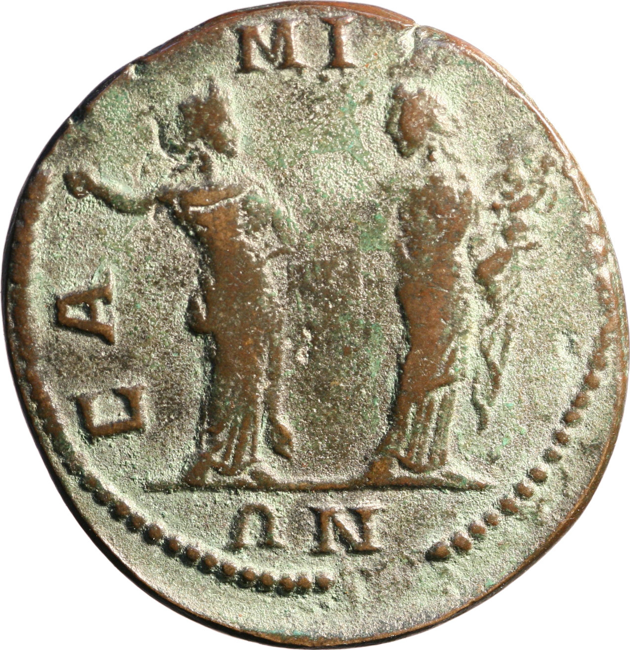 to left, female figure standing right, wearing stephane, raising right arm and resting left arm on her hip; to right, Eirene?, standing left, veiled, holding patera and child; the child holds cornucopia