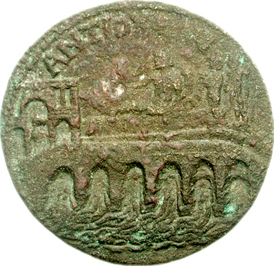 bridge with six arches over Maeander river; above, bridge-gateway and river god Maeandros reclining, right, holding reed and cornucopia; beside, two standing figures, left
