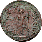 Zeus seated left, holding Nike and sceptre; at feet, left, eagle