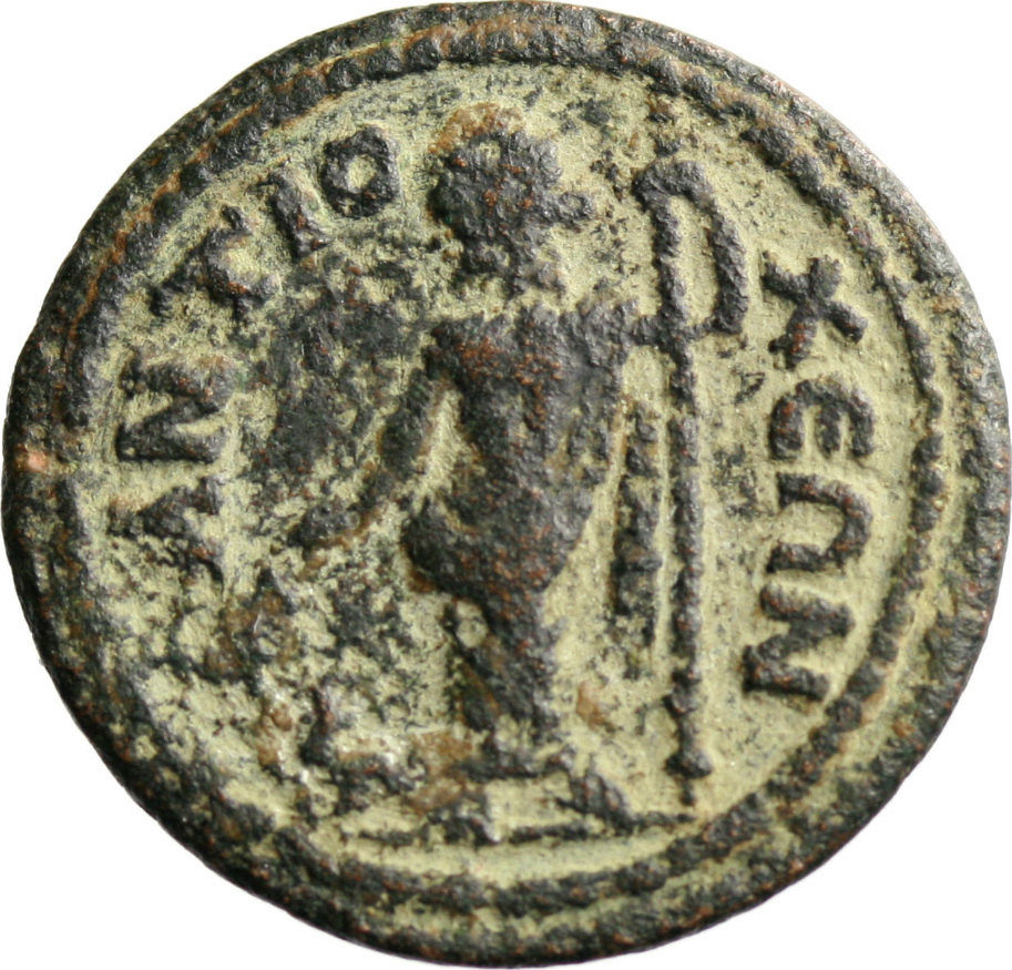 Dionysus standing left, holding cantharus over panther and thyrsus