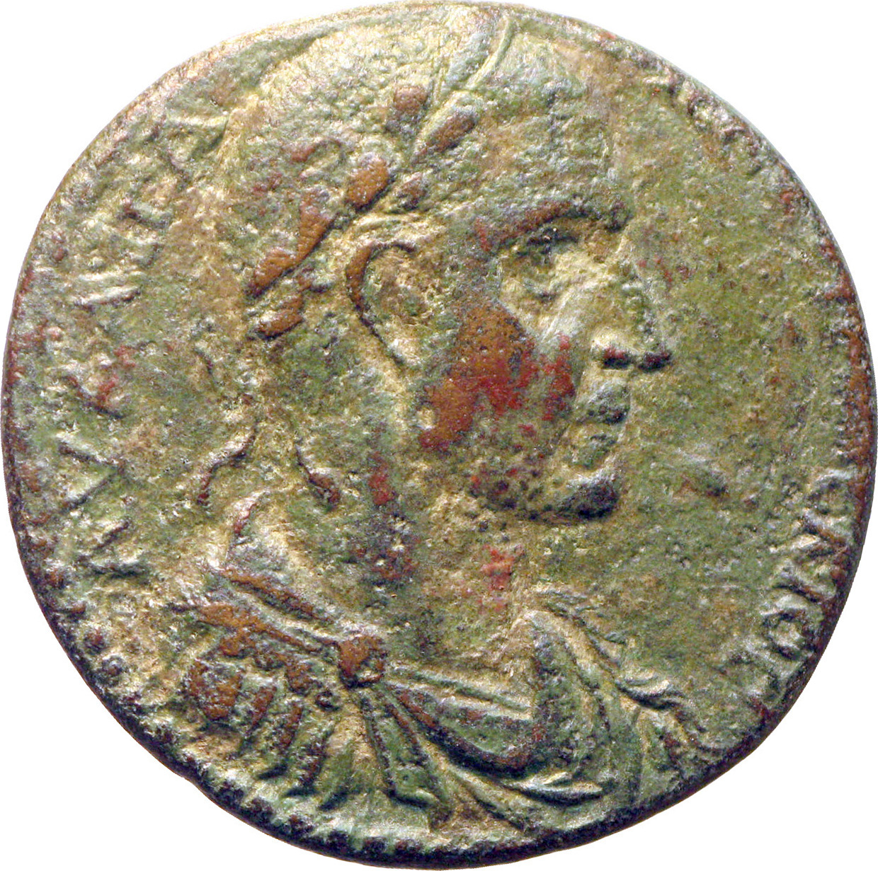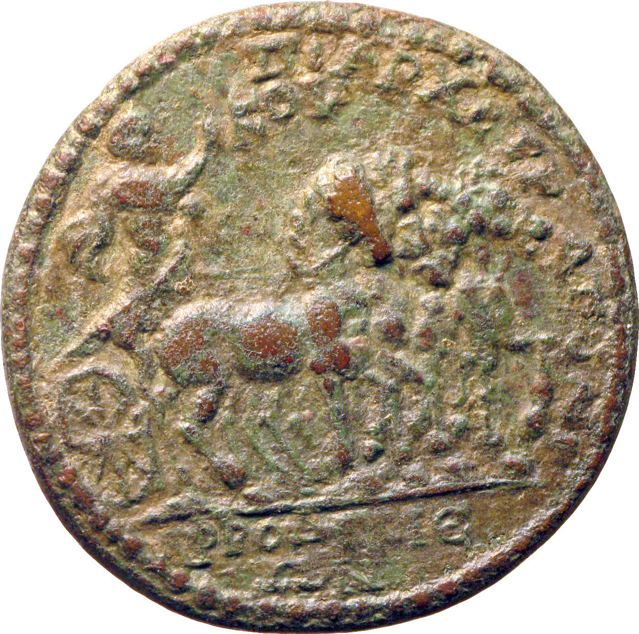 Decius riding in quadriga of horses, right, raising right arm |