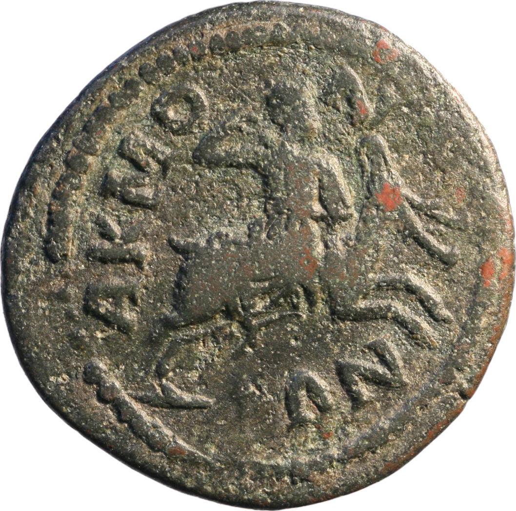 Artemis seated facing, head right, riding on galloping stag right, drawing arrow from quiver over shoulder