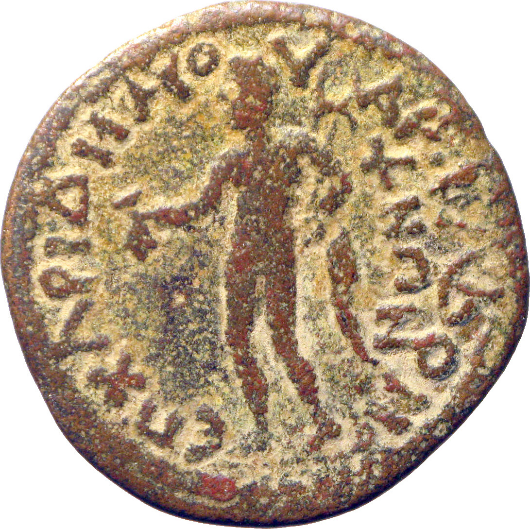 nude Hermes standing left, holding purse, chalmys and caduceus |