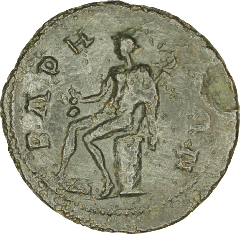 Hermes seated left, on cippus, holding purse and caduceus