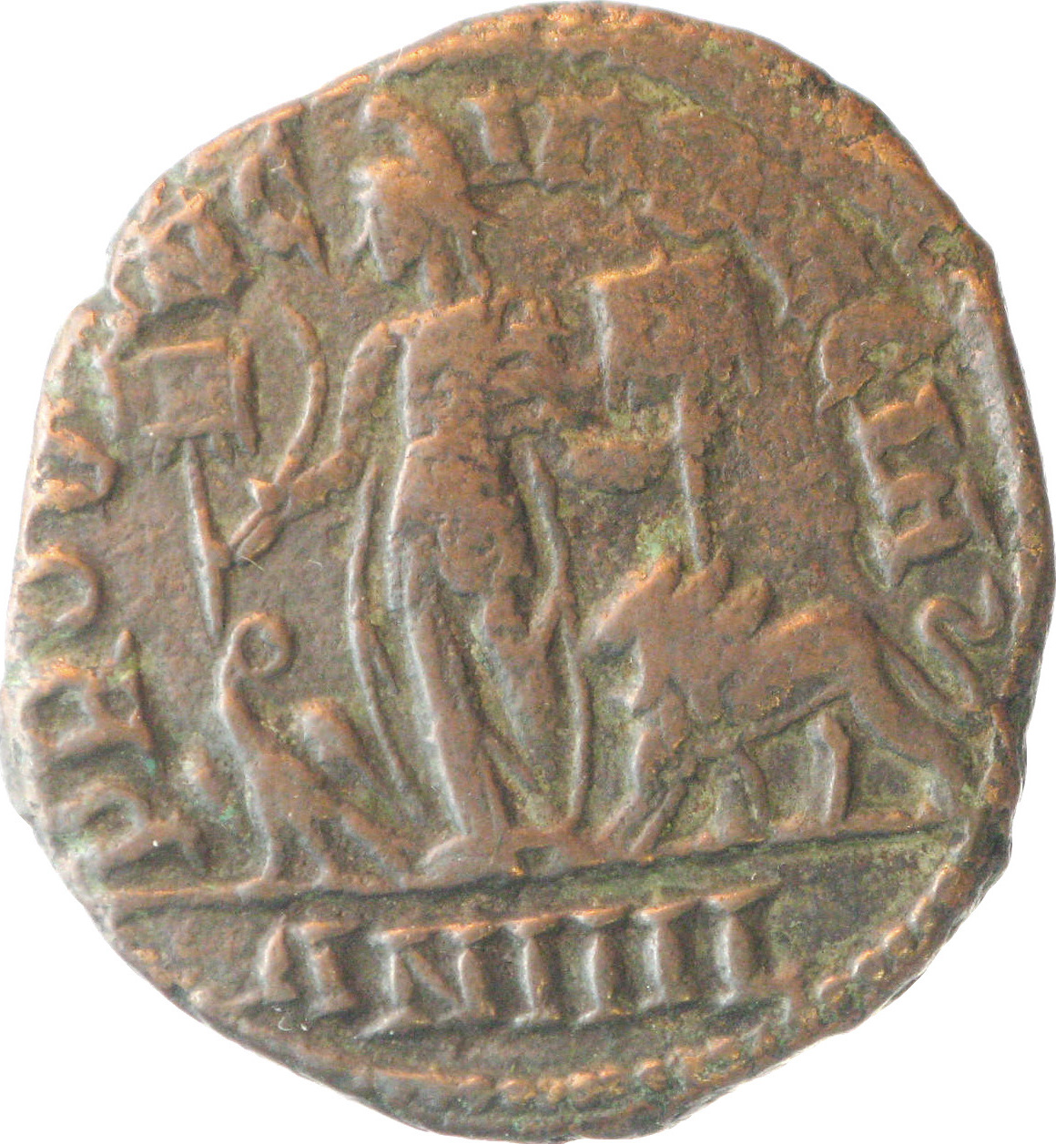 Dacia, wearing Dacian cap, standing left, holding two vexilla inscribed V and XIII and sword; at left, eagle standing left, head right, holding wreath in beak; at right, lion standing left