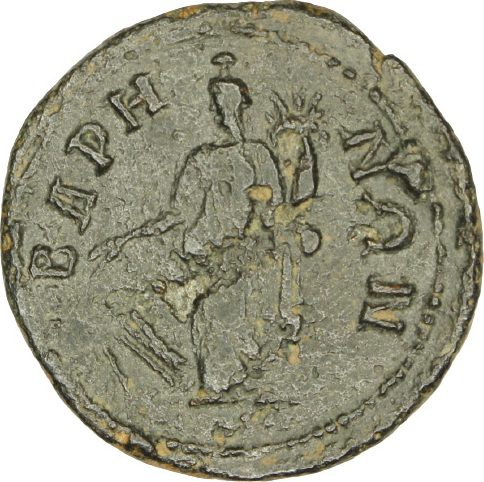 Tyche standing left, holding rudder and cornucopia