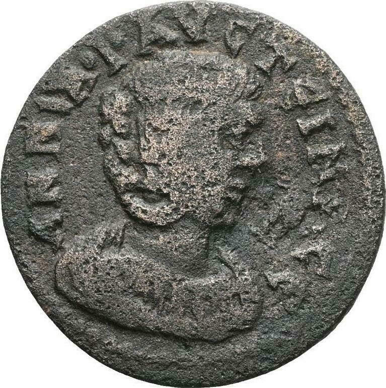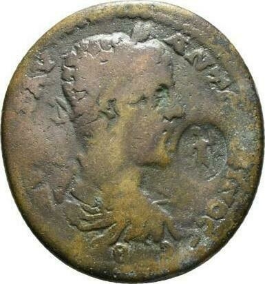 Mên standing l. holding pinecone and sceptre used as a type at Hierapolis. Updated from GIC which had "Male figure holding lance or sceptre and an uncertain object" It referenced that the uncertain figure might be Zeus or Mên. Further example seem to show Mên.