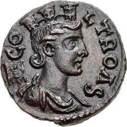 draped bust of Tyche, right; behind her, inscribed (?) vexillum