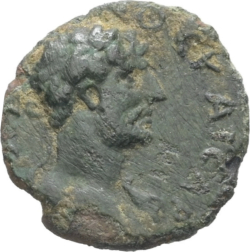 bare head of Marcus Aurelius (medium length beard), right