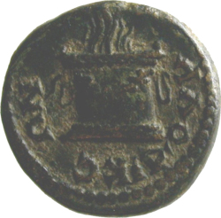 to left, Demeter of Nicomedia standing, right, holding poppy, two ears of corn and long torch; to right, Zeus (Laodiceus) standing, left, holding eagle and long sceptre; between, lighted altar