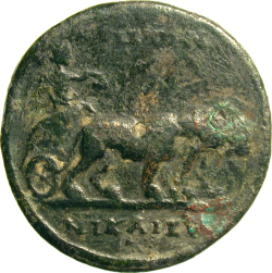 Dionysus (youthful) standing in biga drawn by panthers, right, holding transverse thyrsus and bunch of grapes