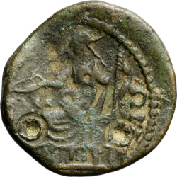 Athena standing left, holding uncertain attribute and sceptre; in front, shield