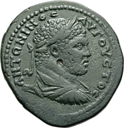 ΑΝΤΩΝ(Ε)ΙΝΟϹ ΑΥΓΟΥϹΤΟϹ; laureate, draped and cuirassed bust of Caracalla, right, seen from rear