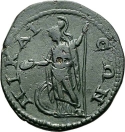 ΝΙΚΑΙΕΩΝ; Ares standing facing, head left, wearing helmet, resting right arm on shield and left on spear