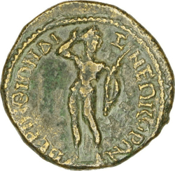 ΠΕΡΙΝΘΙΩΝ ΔΙϹ ΝΕΩΚΟΡΩ; Dionysus standing left, holding cantharus and thyrsus