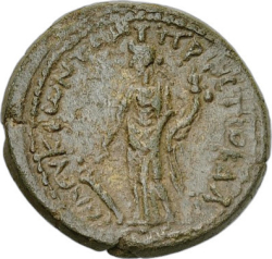 [ϹΕΛ]ΕΥΚΕωΝ ΤωΝ ΠΡΟϹ Τω ΚΑΛ[; Tyche standing, left, wearing kalathos, holding rudder and cornucopia