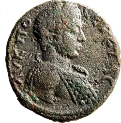 bare-headed, draped and cuirassed bust of Caracalla, right, seen from rear