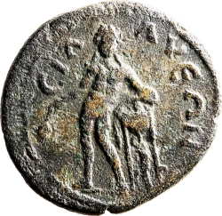 Mên standing right, wearing crescent on shoulders, holding pine cone and sceptre