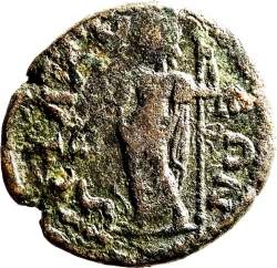 Mên standing right, crescent at shoulders, holding sceptre and pine cone, left foot on bucranium