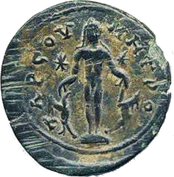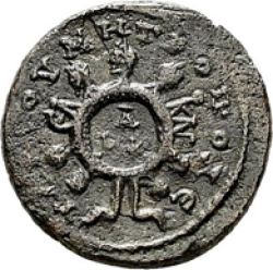 Tyche of the City seated on rocks, left, holding ears of corn; at her feet, river god swimming, left