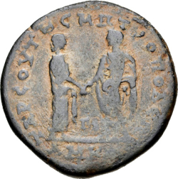 ΤΑΡϹΟΥ ΤΗϹ ΜΗΤΡΟΠΟΛΕΩ Α Μ Κ Γ Β; Julia Paula, standing right in long chiton clasping hands with Elagabalus, standing left in toga