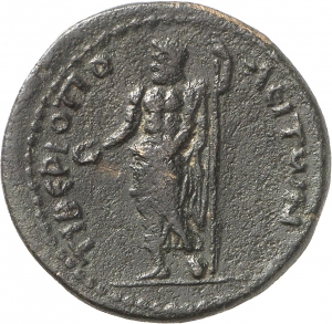 ΤΙΒΕΡΙΟΠΟΛΟΕΙΤΩΝ; Artemis standing left, holding bow and arrow (?); at her feet, left, stag, and right, small figure