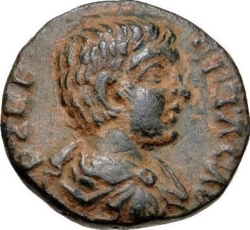 L SEP GETAE CO; laureate and draped bust of Geta, right, seen from rear
