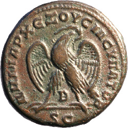 eagle standing on line, facing, head right, spreading wings, holding wreath in beak; between legs: Ϛ