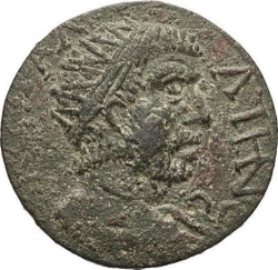 ΑΝΤΙΟΧΕΩΝ, ΓΑΛΛΙΗΝ (on prize crown), ΚΑΠΕΤΩΛΙΑ (on edge of table); inscribed prize crown with two palm branches, between two purses on inscribed table, with curved legs; beneath table, vase