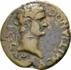 ΔΟΜΙΤΙΑΝΟϹ ΚΑΙϹΑΡ; laureate head of Domitian, right