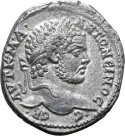 ΑΥΤ Κ Μ Α ΑΝΤΩΝΙΝΟϹ ϹΕ; laureate head of Caracalla, right