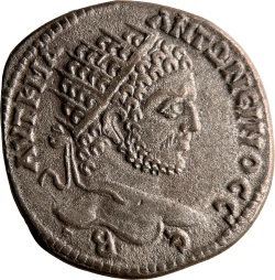 ΑΥΤ Κ Μ Α ΑΝΤΩΝΕΙΝΟϹ ϹΕΒ; radiate head of Caracalla, right