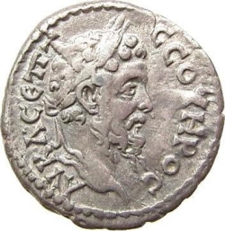 laureate head of Septimius Severus, right, (with drapery on shoulder)