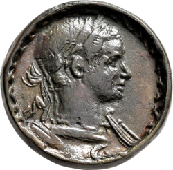 ΗΡΑΚΛΕΩΤΑΝ ΜΑΤΡΟϹ ΑΠΟΙΚΩΝ ΠΟΛΙΩΝ; view of an amphitheatre; to left, temple with six columns seen in perspective; in the centre, athlete (?) holding palm, crowning himself (?), standing in front of seated statue of Heracles, holding patera, a club behind him