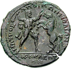 [ΗΡ]ΑΚΛΗΑϹ ΜΑΤΡΟϹ, [Α]ΠΟΙΚΩΝ Π[ ] (retrograde); Heracles standing right, brandishing club and grasping by her hair Hippolyte, queen of the Amazons, kneeling right in front of her fallen horse