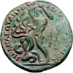 ΗΡΑΚΛΕΩΤΑΝ ΜΑΤΡΟϹ ΑΠΟΙΚΩΝ ΠΟΛΙΩΝ; Heracles standing left, brandishing club and grasping the Lernaean hydra; to right, quiver and bow