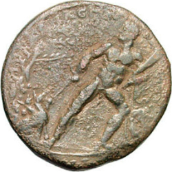 ΜΑΤΡΟϹ ΑΠΟΙΚΩΝ ΠΟΛΙΩΝ ΗΡΑΚΛΕΩΤΑΝ; Heracles standing right, brandishing club, preparing to strike Mares of Diomedes
