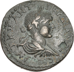 laureate, draped and cuirassed bust of Gordian III, right, seen from front