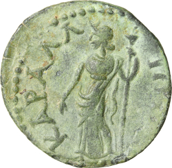 Athena standing facing, head left, holding Nike and spear