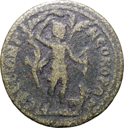 ΕΦΕϹΙΩΝ Γ ΝΕΟΚΟΡΩΝ; Artemis standing right in front of tree, drawing arrow from quiver at shoulder and holding bow; at feet, stag