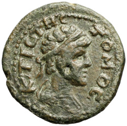 Asclepius standing, facing, head, left, holding serpent-staff; in left or right field, left, Β