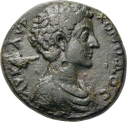 bare-headed bust of Commodus (youthful) wearing paludamentum, right