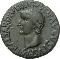 AVGVSTVS DIVI F; laureate head of Augustus, right