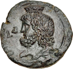 draped bust of Sarapis wearing kalathos and laurel wreath (or taenia), right