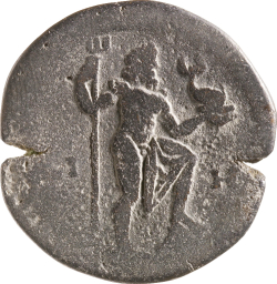 Tyche-Euthenia standing, facing, head, left, holding ears of corn and rudder; to left, forepart of sailing ship; below which, Thalassa (the Sea) reclining; to right, stern of ship, below which, Nilus reclining, crowned with lotus, holding rudder
