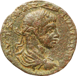 laureate, draped and cuirassed bust of Elagabalus, right, seen from rear